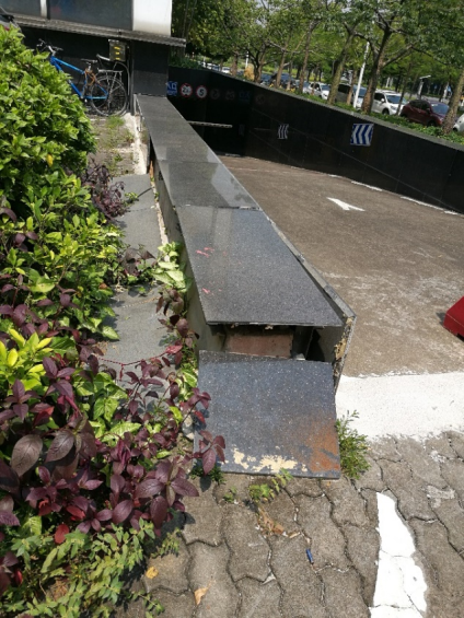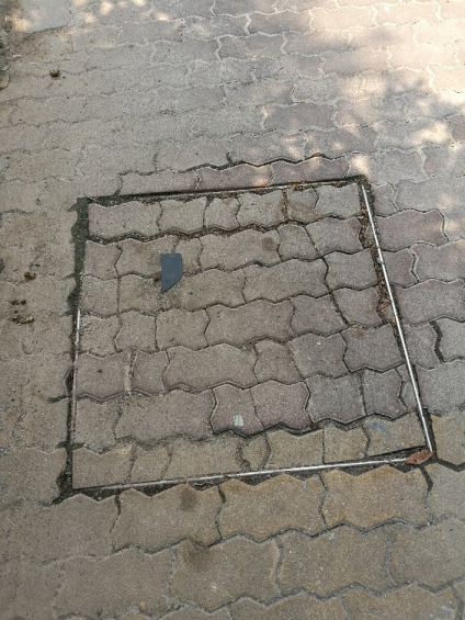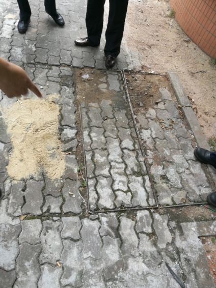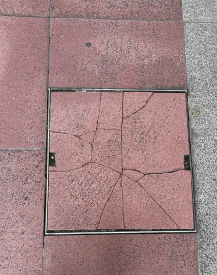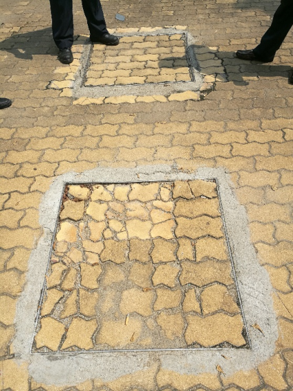 大学城信息枢纽楼广场地面已投入使用十年,出现广场砖及大理石损环,砂井盖上面有地砖,使用不方便,对砂井整体升高,露出井盖。