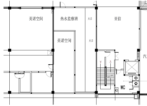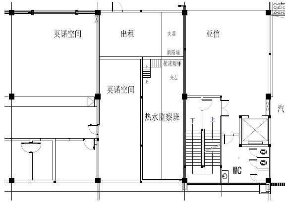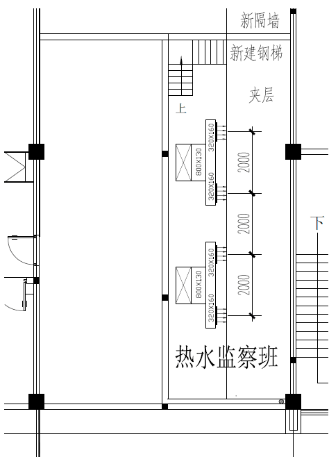 我司枢纽楼副楼一层热水监察班要分隔成两间。监察班的电、消防、空调需改造,并增加空调流量计;夹层做热水监察班仓库,需加装楼梯。