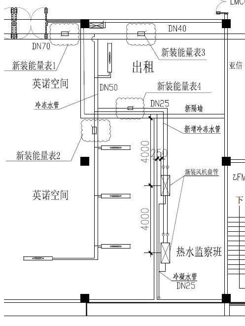 1) 需要增加四套空调计费能量表,见图3,在英诺空间进入新出租房间前DN70冷冻水管处安装能量表1,用于计量新出租、热水监察班、亚信及英诺空间末端各区的用冷量;