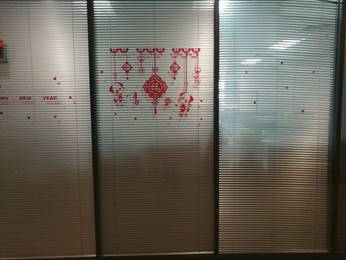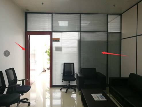 (2) 玻璃墙采用双层玻璃内置百叶隔断,并安装门一扇。