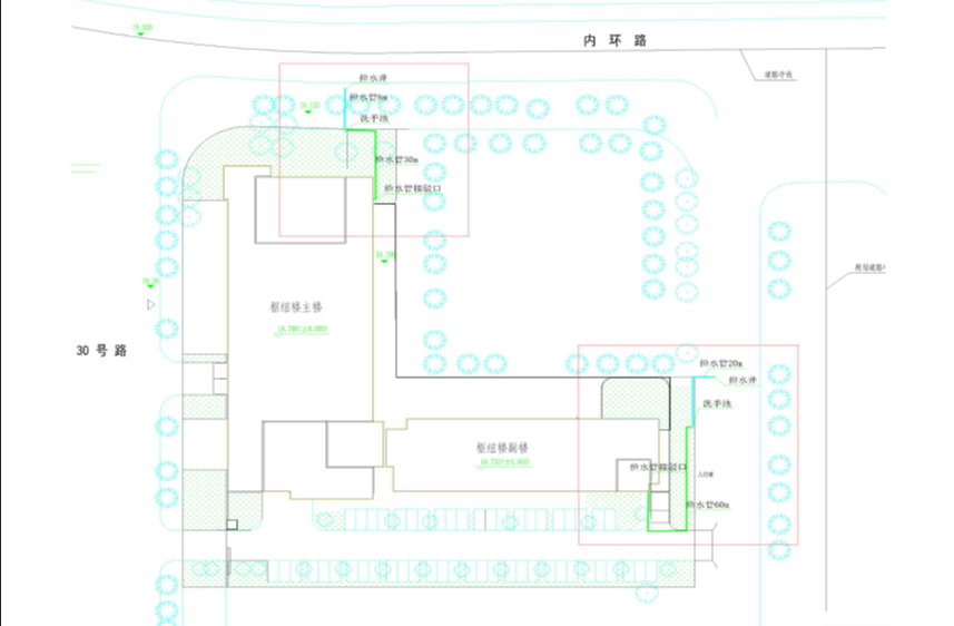 在信息枢纽楼东侧、北侧两处各设置一个洗手池,同时配备压式延时水龙头,给排水就近接驳安装,详见洗手池、给排水平面位置布置图见附图1;洗手池基础剖面及水管安装示意图见附图2。