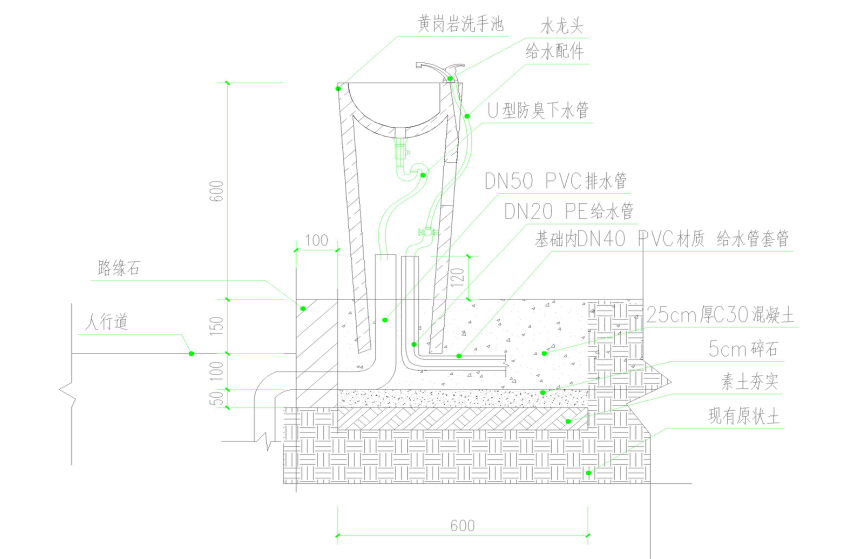 | 14 | 洗手池 基础 | 个 | 2 | 1、人工开挖原状土长宽深1000mm*600mm*300mm 2、铺5cm厚碎石并压实 3、浇注长宽厚1000mm*600mm*250mmC30混凝土,基础顶面标高比现有人行道高15cm |